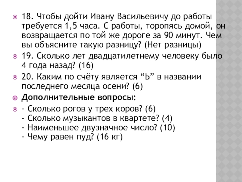 19. Сколько лет двадцатилетнему человеку было 4 года назад? (16)