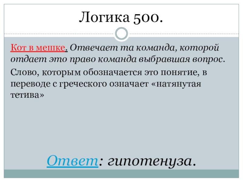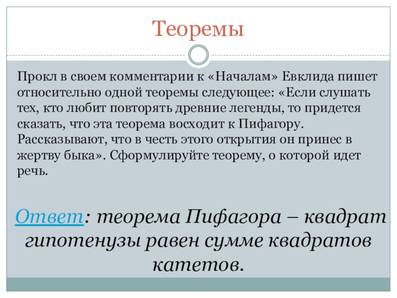 Ответ: теорема Пифагора – квадрат гипотенузы равен сумме квадратов катетов.