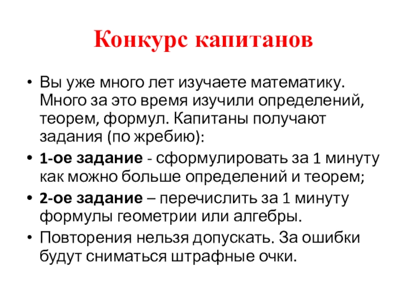 изучили определений, теорем, формул. Капитаны получают задания (по жребию):