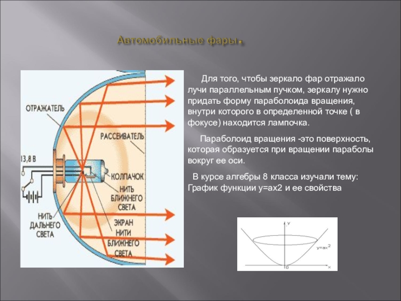 Для того, чтобы зеркало фар отражало лучи параллельным пучком, зеркалу нужно придать форму параболоида