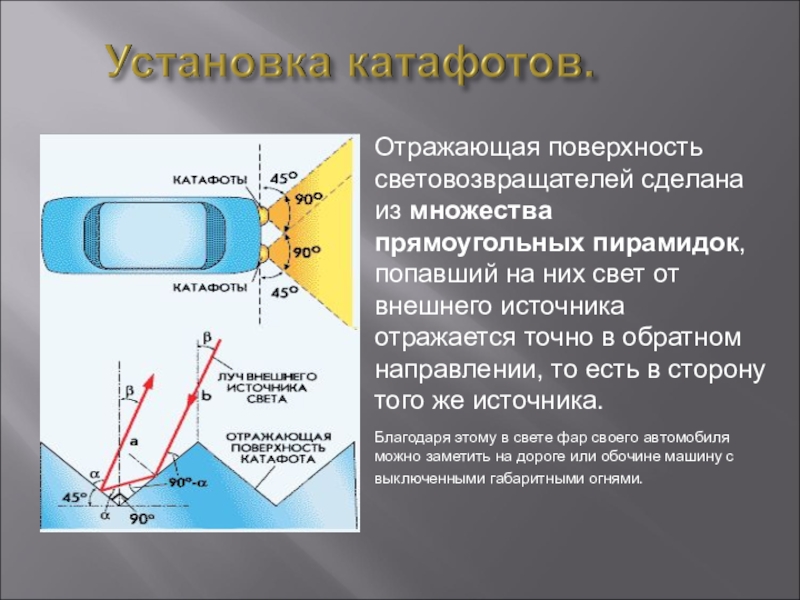 Отражающая поверхность световозвращателей сделана из множества прямоугольных пирамидок, попавший на них