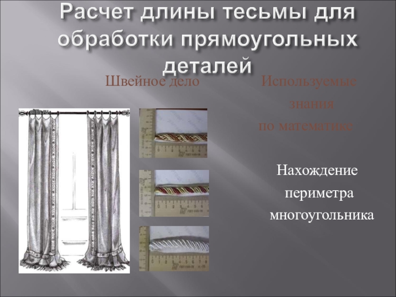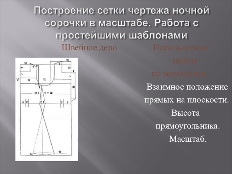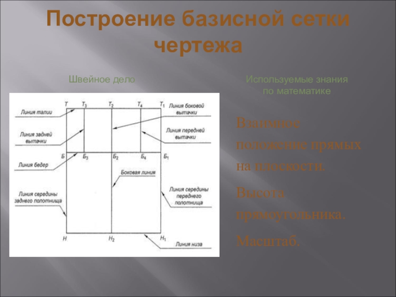 Построение базисной сетки чертежаШвейное делоИспользуемые знания по математикеВзаимное положение прямых на плоскости. Высота прямоугольника.  Масштаб.