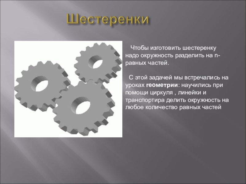 Чтобы изготовить шестеренку надо окружность разделить на n-равных частей.  С этой задачей мы встречались