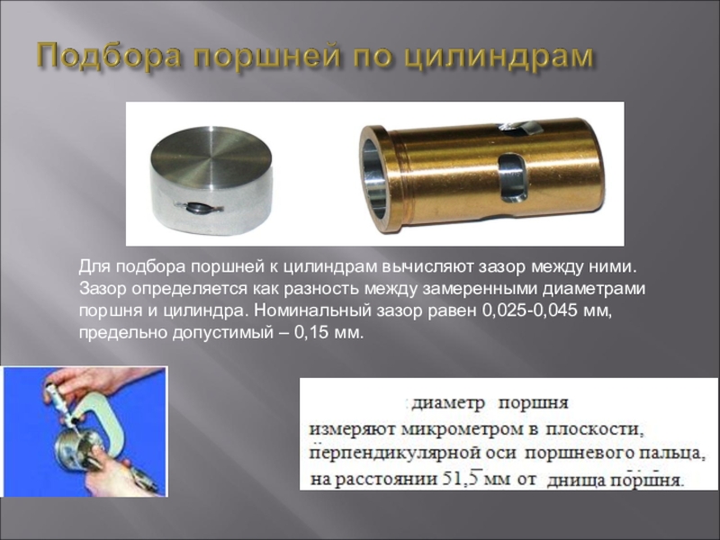 Слайд 7Для подбора поршней к цилиндрам вычисляют зазор между ними. Зазор определяется