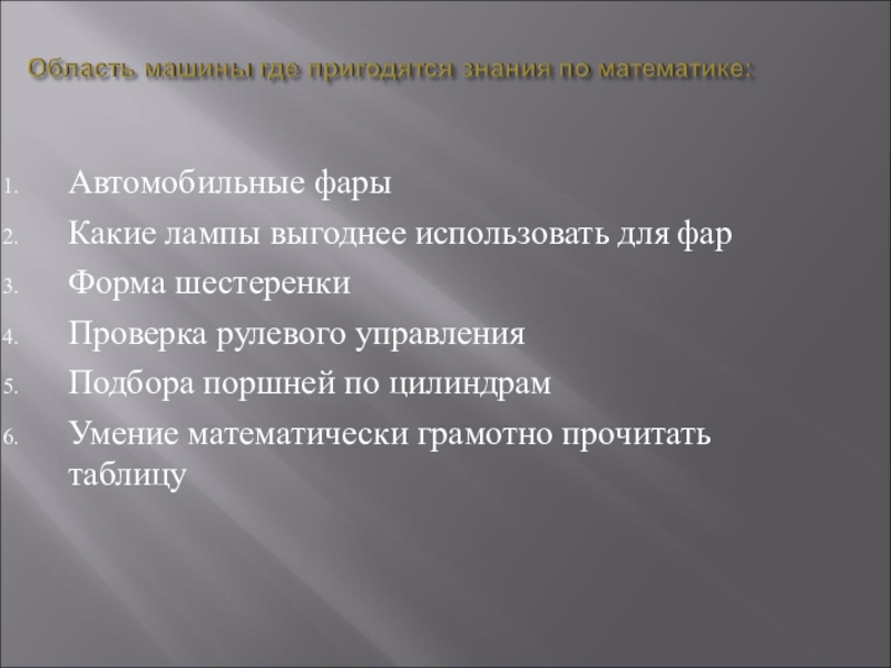 Автомобильные фары Какие лампы выгоднее использовать для фарФорма шестеренкиПроверка рулевого управленияПодбора поршней по цилиндрам Умение математически грамотно