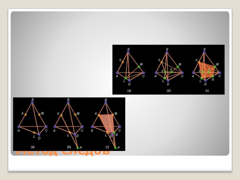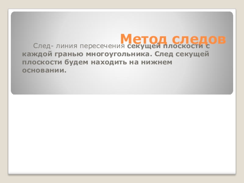 Метод следов	След- линия пересечения секущей плоскости с каждой гранью многоугольника. След секущей плоскости будем находить на нижнем