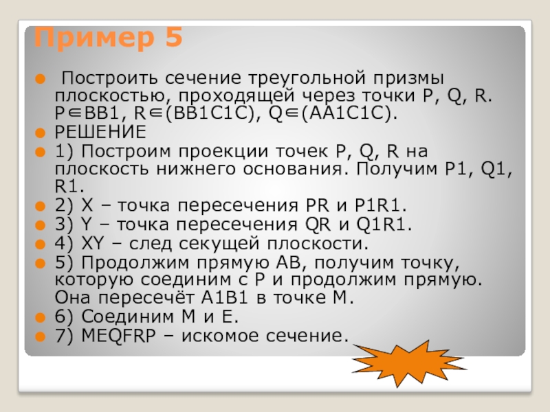 Пример 5 Построить сечение треугольной призмы плоскостью, проходящей через точки P, Q, R. P∈ВВ1, R∈(ВВ1С1С), Q∈(АА1С1С).РЕШЕНИЕ1) Построим