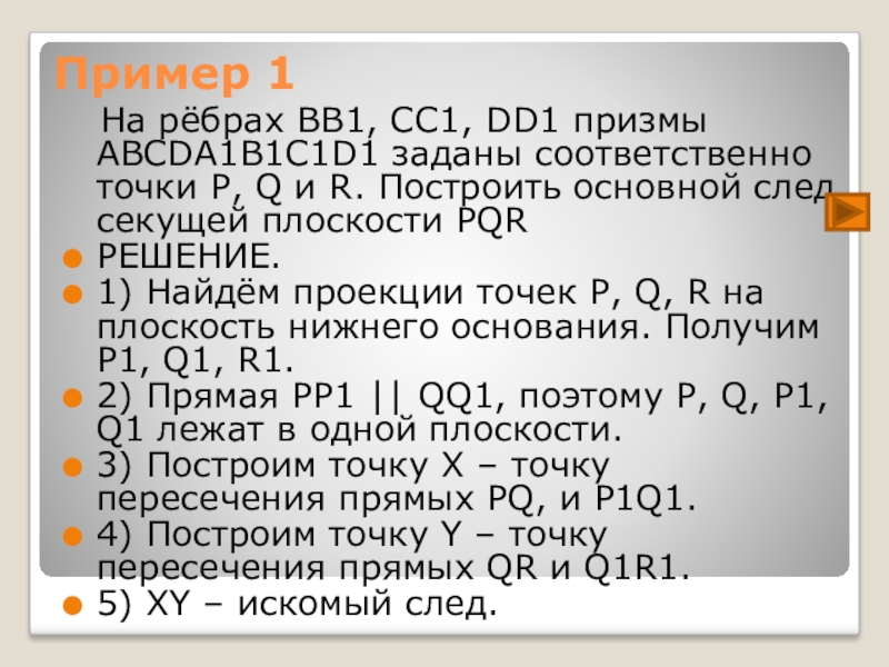 Пример 1  На рёбрах ВВ1, СС1, DD1 призмы АВСDА1В1С1D1 заданы соответственно точки Р, Q и R.