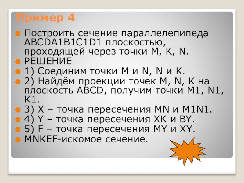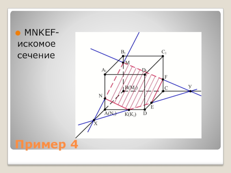 Пример 4Построить сечение параллелепипеда АВСDА1В1С1D1 плоскостью, проходящей через точки М, К, N.РЕШЕНИЕ1) Соединим точки M и N,