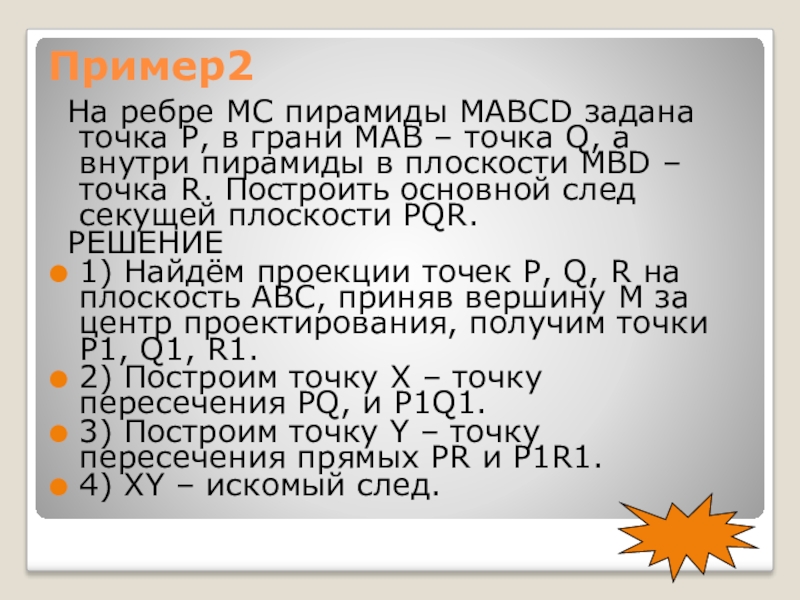 МАВ – точка Q, а внутри пирамиды в плоскости МВD – точка R. Построить основной след секущей плоскости PQR.
