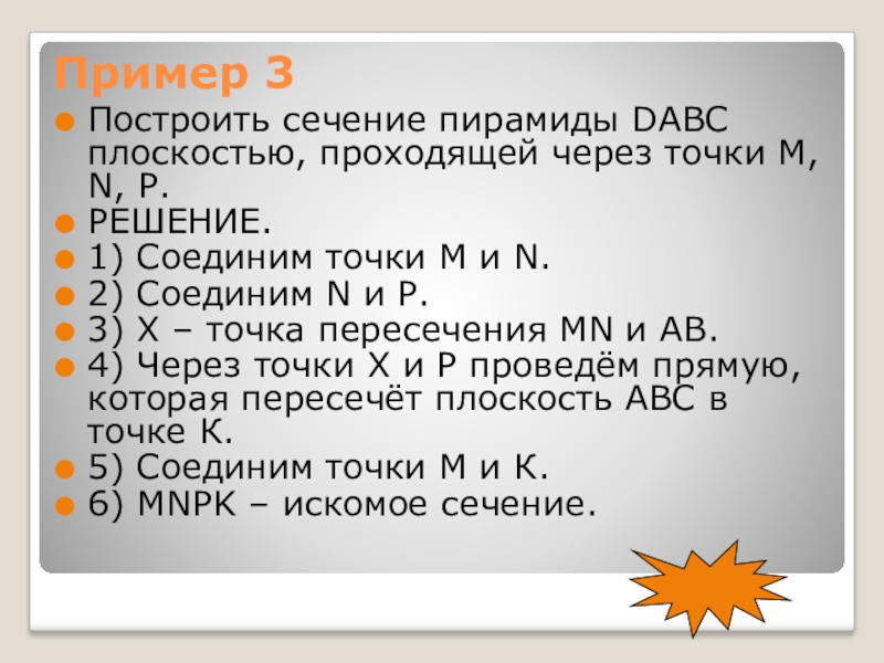 Пример 3Построить сечение пирамиды DАВС плоскостью, проходящей через точки М, N, P.РЕШЕНИЕ.1) Соединим точки М и N.2)
