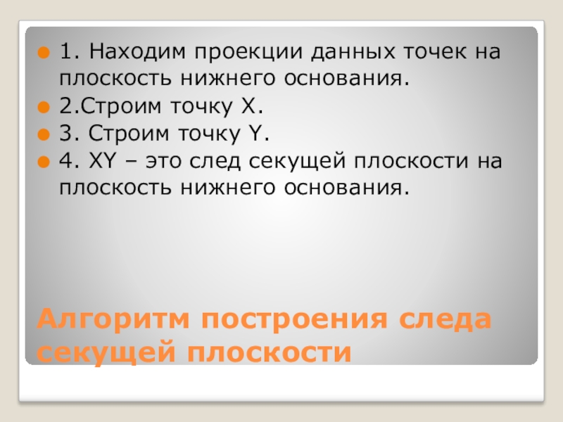 Алгоритм построения следа секущей плоскости1. Находим проекции данных точек на плоскость нижнего основания.2.Строим точку X.3. Строим точку