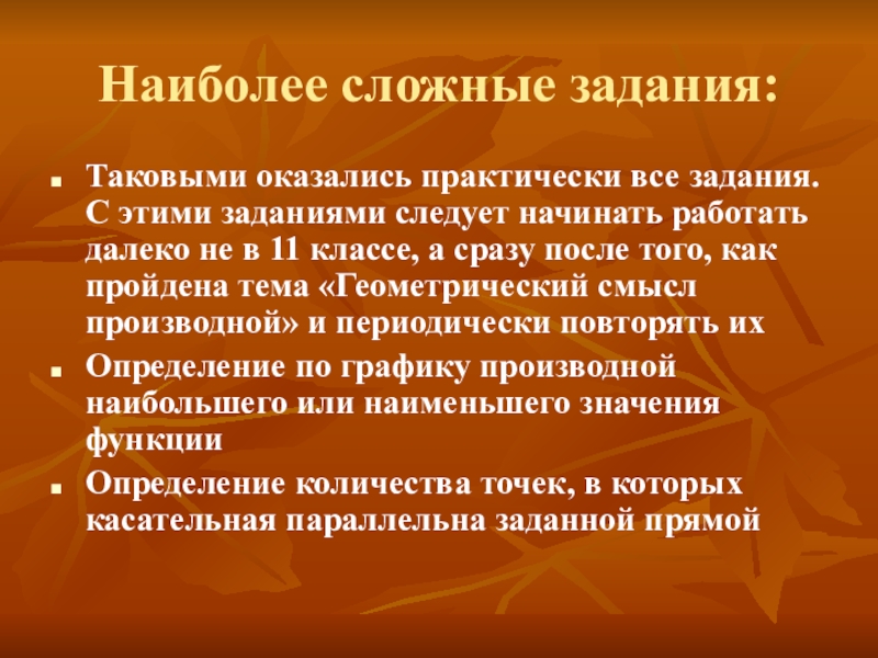 начинать работать далеко не в 11 классе, а сразу после того, как пройдена тема «Геометрический смысл производной» и периодически повторять их