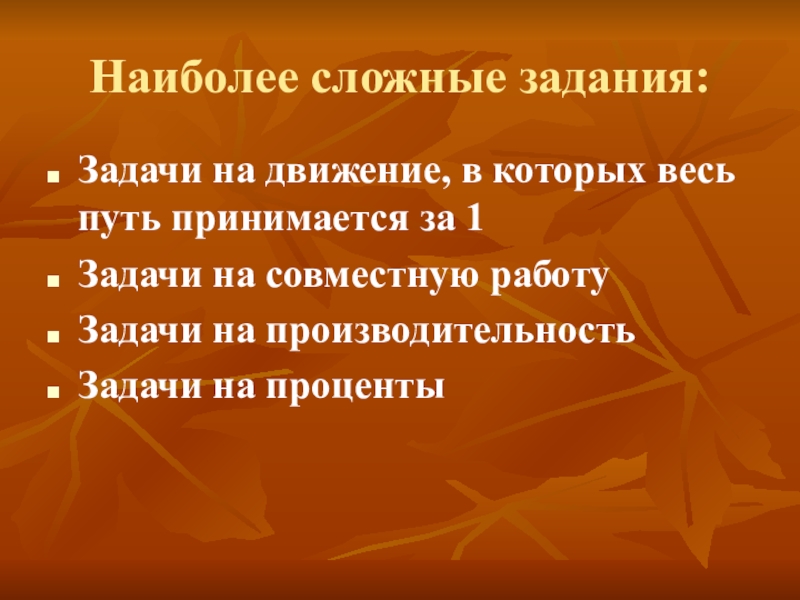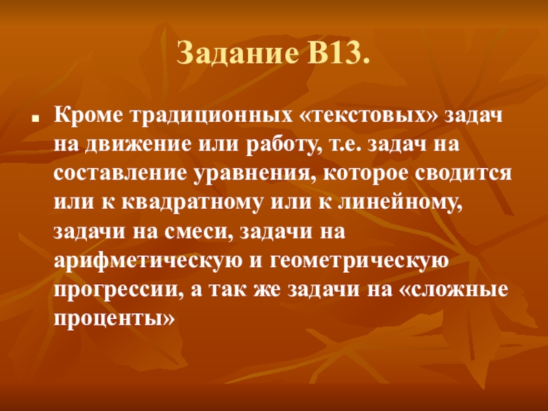 на составление уравнения, которое сводится или к квадратному или к линейному, задачи на смеси, задачи на арифметическую и геометрическую прогрессии, а так же задачи на «сложные проценты»