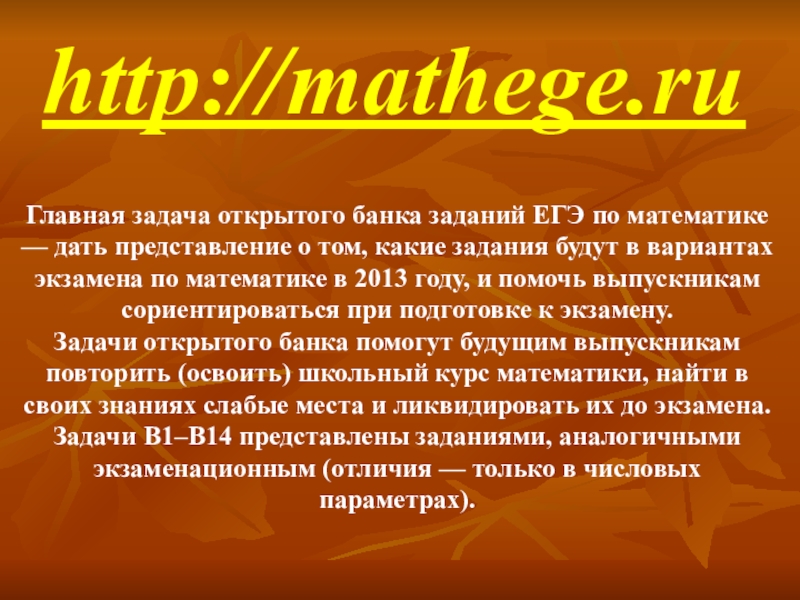 Задачи открытого банка помогут будущим выпускникам повторить (освоить) школьный курс математики, найти в своих знаниях слабые места и ликвидировать их до экзамена. Задачи В1–В14 представлены заданиями, аналогичными экзаменационным (отличия — только в числовых параметрах).