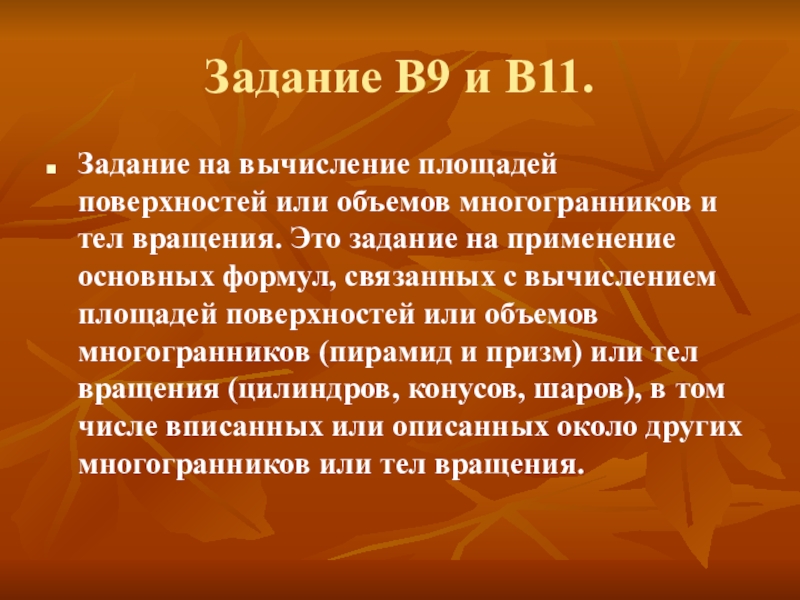 и тел вращения. Это задание на применение основных формул, связанных с вычислением площадей поверхностей или объемов многогранников (пирамид и призм) или тел вращения (цилиндров, конусов, шаров), в том числе вписанных или описанных около других многогранников или тел вращения.