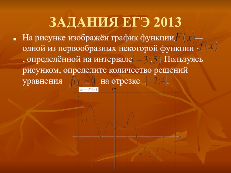 одной из первообразных некоторой функции , определённой на интервале . Пользуясь рисунком, определите количество решений уравнения на отрезке .