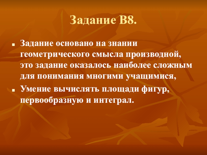 Задание основано на знании геометрического смысла производной, это задание оказалось