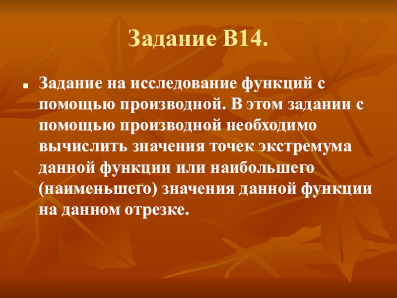 с помощью производной необходимо вычислить значения точек экстремума данной функции или наибольшего (наименьшего) значения данной функции на данном отрезке.