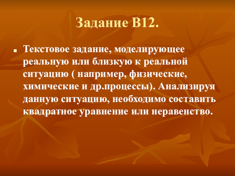 например, физические, химические и др.процессы). Анализируя данную ситуацию, необходимо составить квадратное уравнение или неравенство.