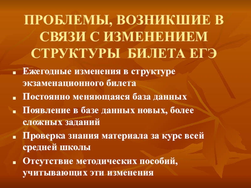 Слайд 4ПРОБЛЕМЫ, ВОЗНИКШИЕ В СВЯЗИ С ИЗМЕНЕНИЕМ СТРУКТУРЫ БИЛЕТА ЕГЭ
