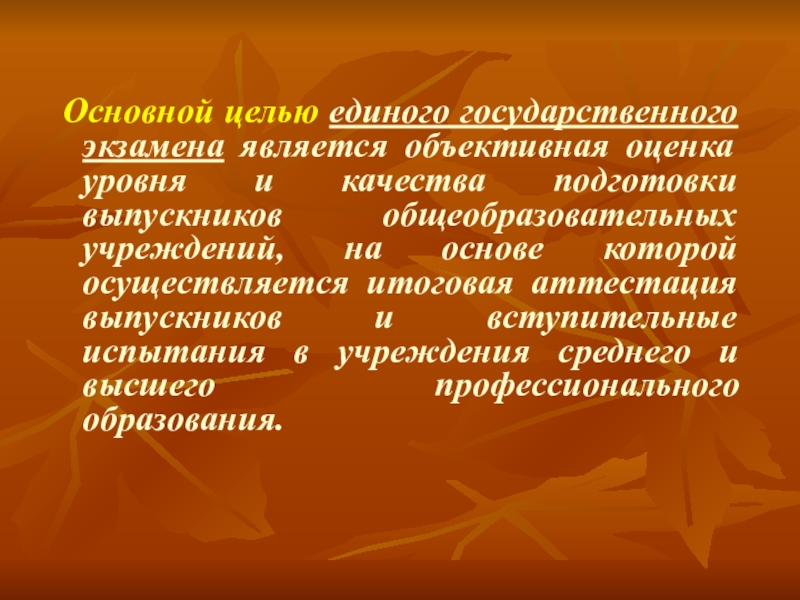 Слайд 2 Основной целью единого государственного экзамена является объективная оценка