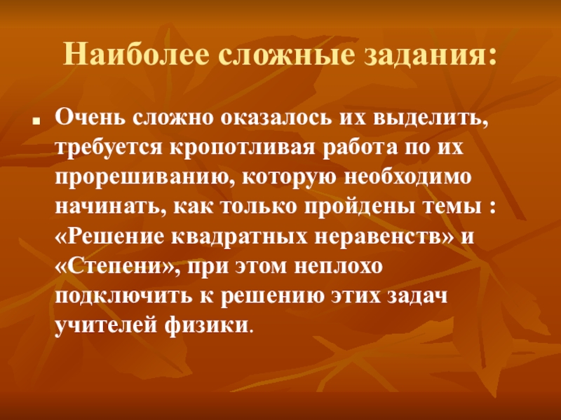 их прорешиванию, которую необходимо начинать, как только пройдены темы : «Решение квадратных неравенств» и «Степени», при этом неплохо подключить к решению этих задач учителей физики.