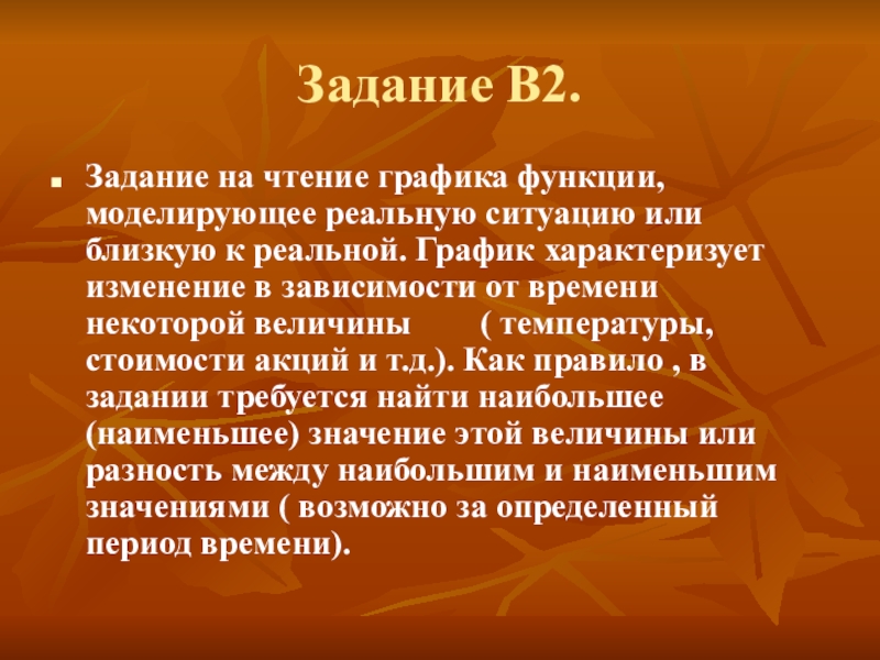 к реальной. График характеризует изменение в зависимости от времени некоторой величины ( температуры, стоимости акций и т.д.). Как правило , в задании требуется найти наибольшее (наименьшее) значение этой величины или разность между наибольшим и наименьшим значениями ( возможно за определенный период времени).