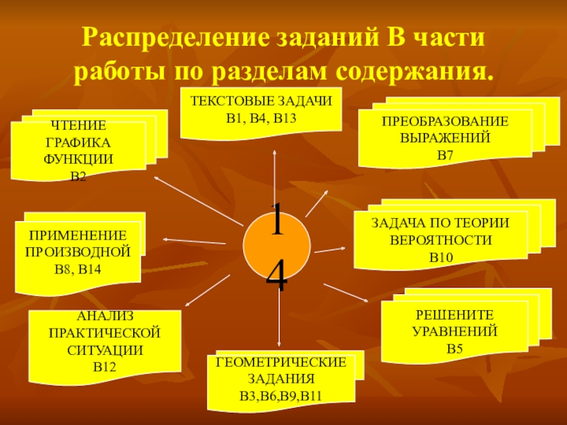 Слайд 5Распределение заданий В части работы по разделам содержания.