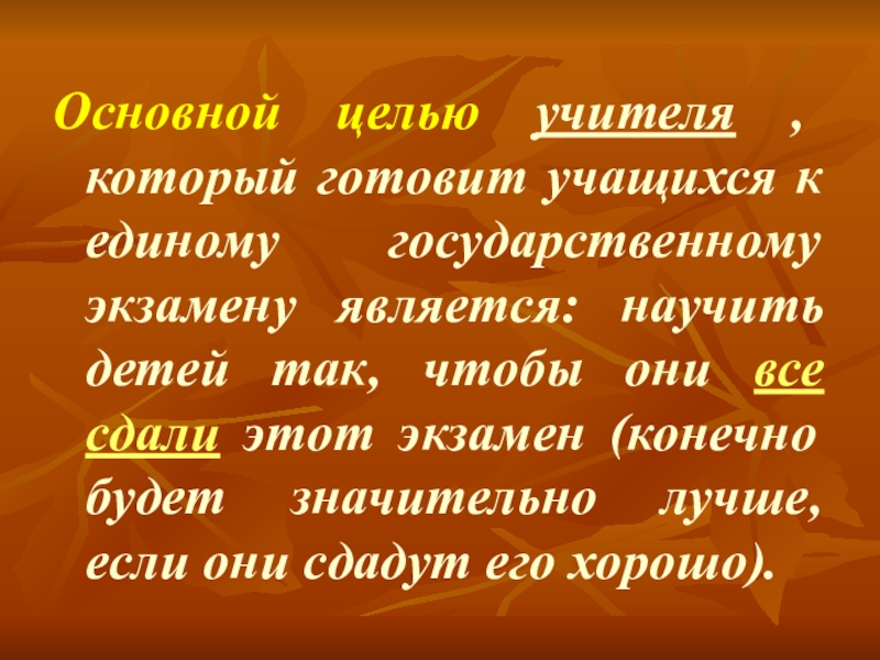 Слайд 3Основной целью учителя , который готовит учащихся к единому государственному экзамену
