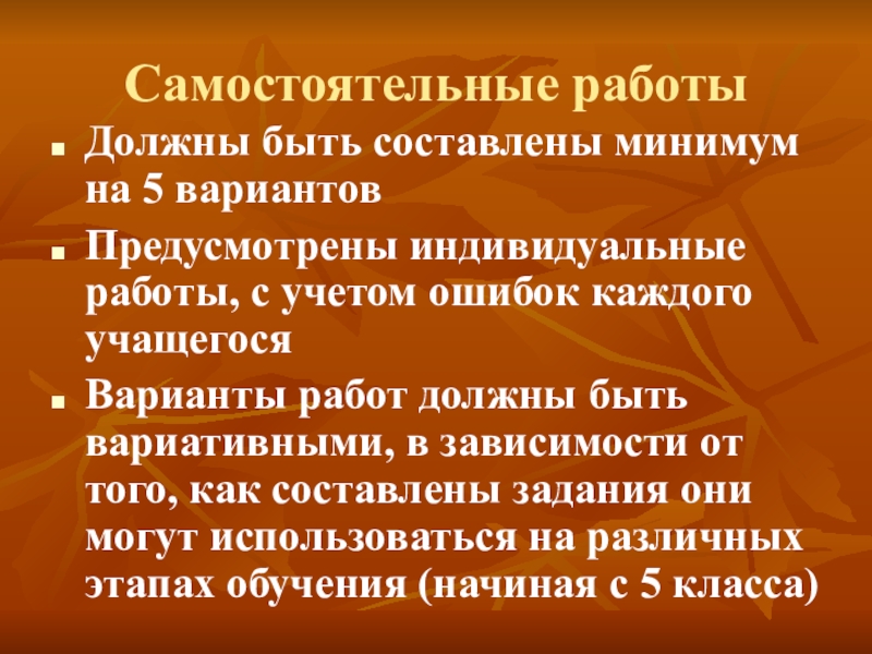 Варианты работ должны быть вариативными, в зависимости от того, как составлены задания они могут использоваться на различных этапах обучения (начиная с 5 класса)