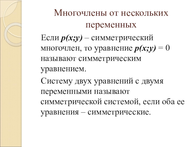 Многочлены от нескольких переменных  Если р(х;у) – симметрический многочлен, то уравнение р(х;у) = 0 называют симметрическим