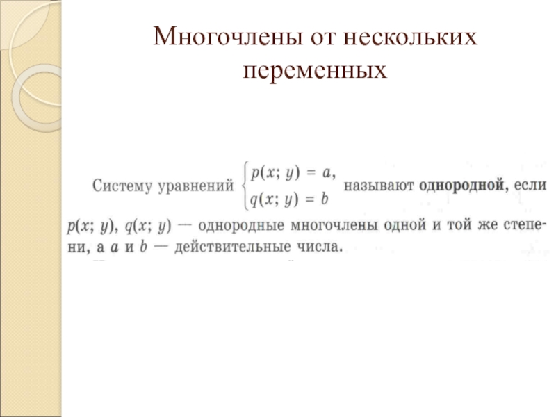 Многочлены от нескольких переменных  Среди многочленов от двух переменных выделяют однородные и симметрические многочлены.