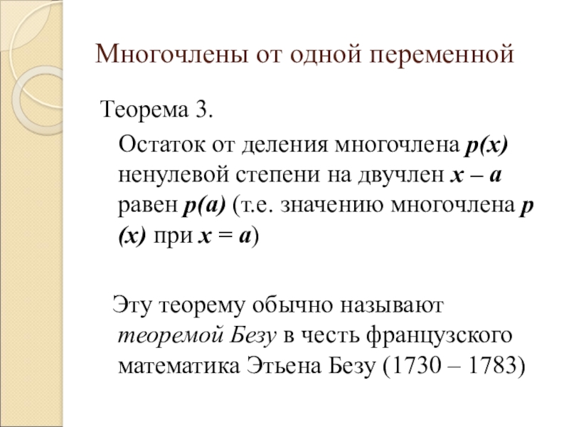 Многочлены от одной переменнойТеорема 3.  Остаток от деления многочлена р(х) ненулевой степени на двучлен х –