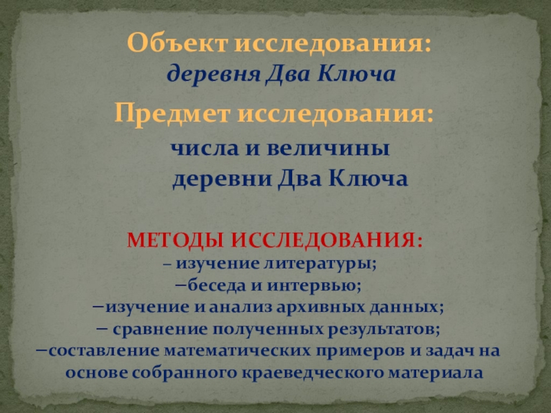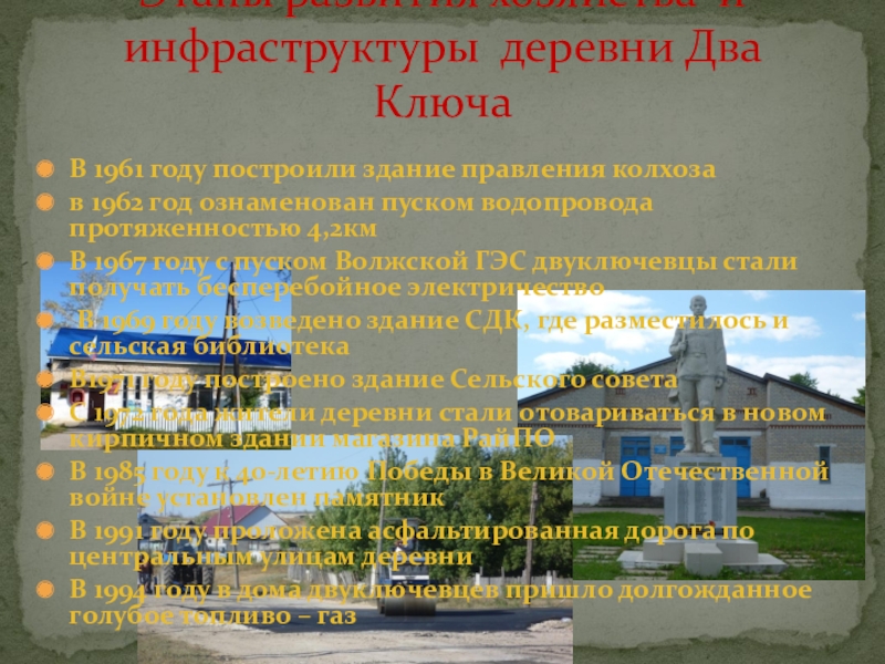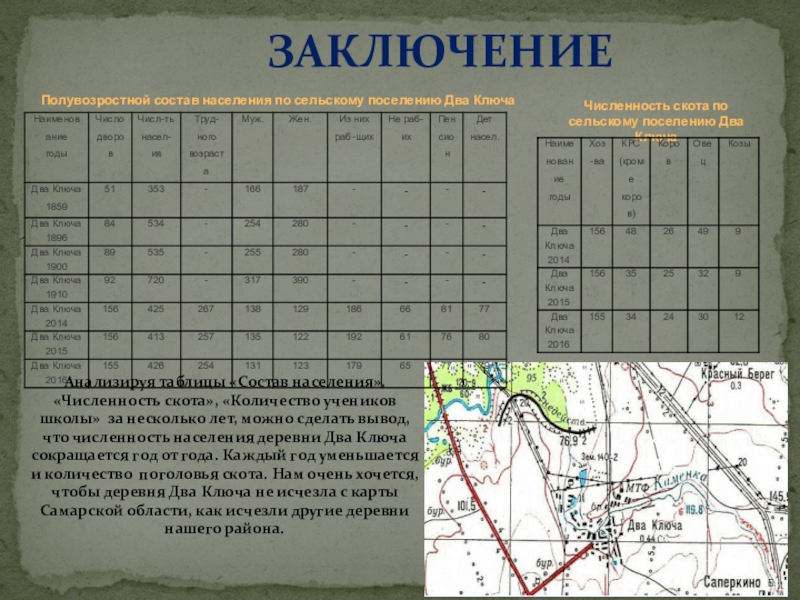 Анализируя таблицы «Состав населения», «Численность скота», «Количество учеников школы» за несколько лет, можно сделать вывод, что численность населения деревни Два Ключа сокращается год от года. Каждый год уменьшается и количество поголовья скота. Нам очень хочется, чтобы деревня Два Ключа не исчезла с карты Самарской области, как исчезли другие деревни нашего района.