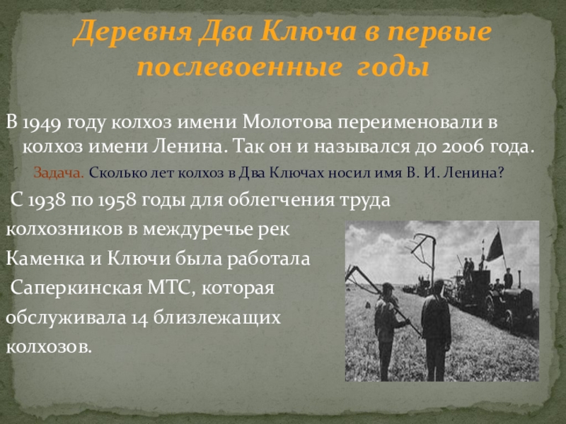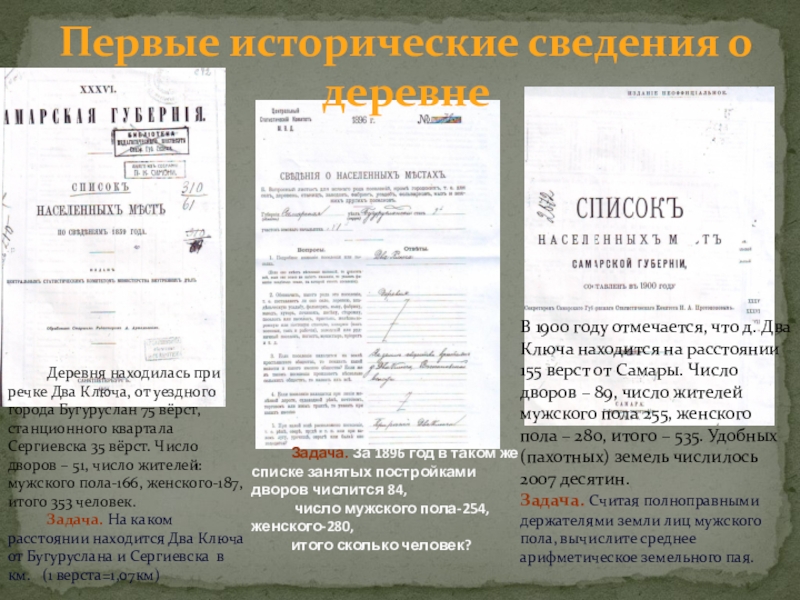 В 1900 году отмечается, что д. Два Ключа находится на расстоянии 155 верст от Самары. Число дворов – 89, число жителей мужского пола 255, женского пола – 280, итого – 535. Удобных (пахотных) земель числилось 2007 десятин. Задача. Считая полноправными держателями земли лиц мужского пола, вычислите среднее арифметическое земельного пая.