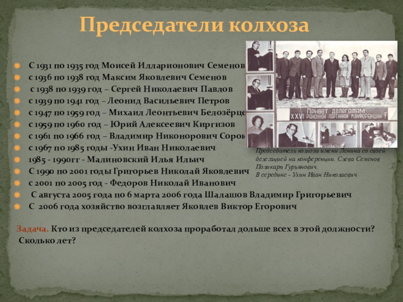 Председатель колхоза имени Ленина со своей делегацией на конференции. Слева Семенов Поликарп Гурьянович.
