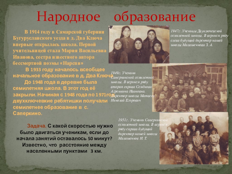 1949г. Ученики Саперкинской семилетней школы. В верхнем ряду вторая справа Семёнова Агреппина Ивановна. Директор школы Матвеев Николай Егорович