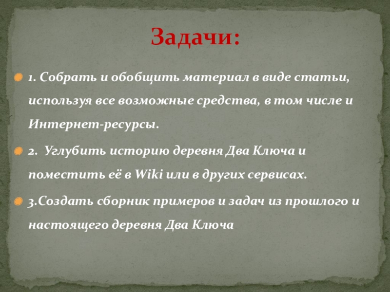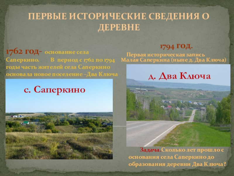 Задача.Сколько лет прошло с основания села Саперкино до образования деревни Два Ключа?
