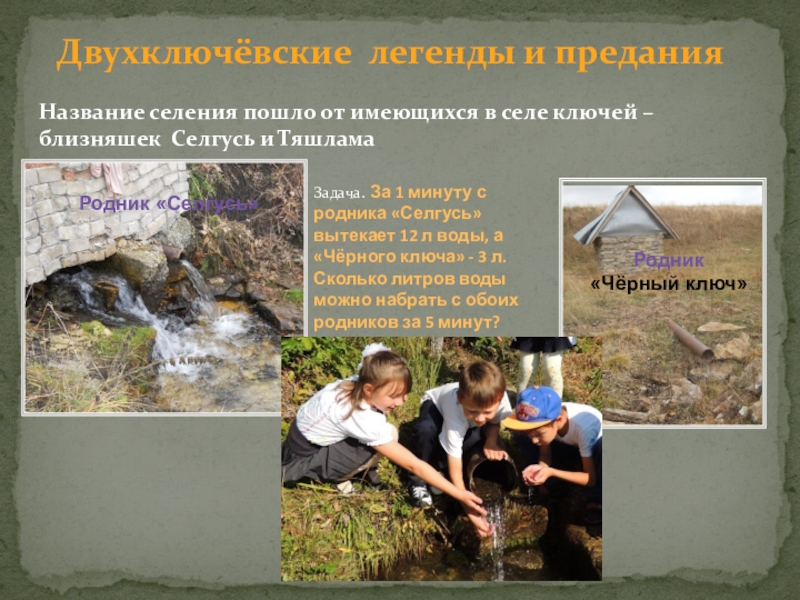 Задача. За 1 минуту с родника «Селгусь» вытекает 12 л воды, а «Чёрного ключа» - 3 л.