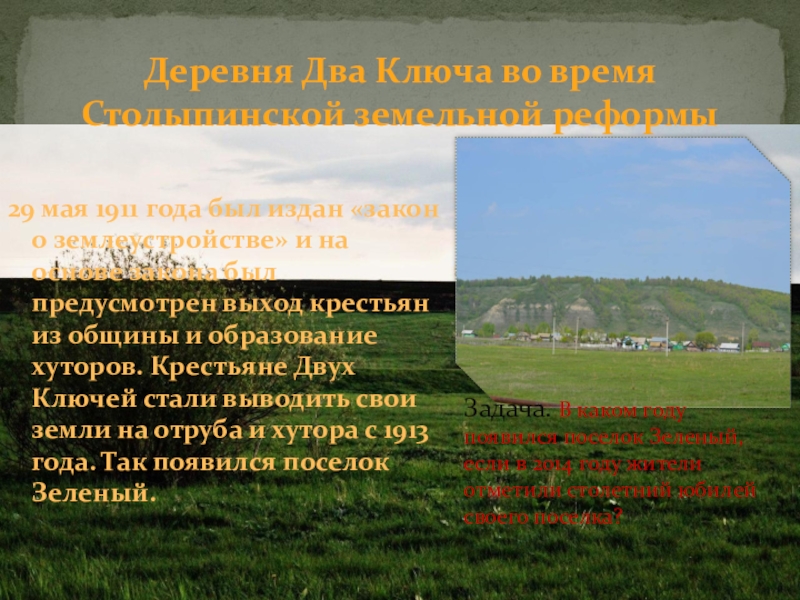 Задача. В каком году появился поселок Зеленый, если в 2014 году жители отметили столетний юбилей своего поселка?