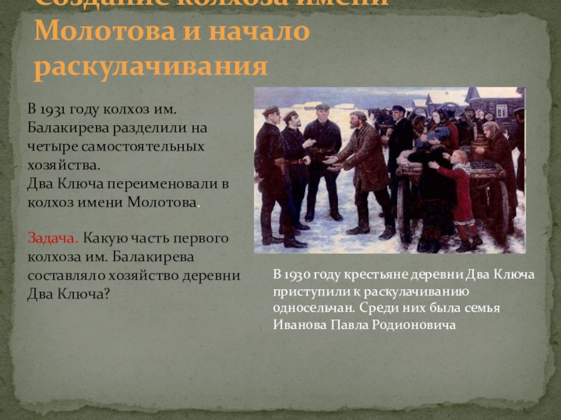 В 1930 году крестьяне деревни Два Ключа приступили к раскулачиванию односельчан. Среди них была семья Иванова Павла Родионовича