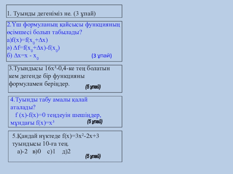 6. f(x) функциясының туындысы 0-ге тең болса,х-тің мәнін табыңдар.