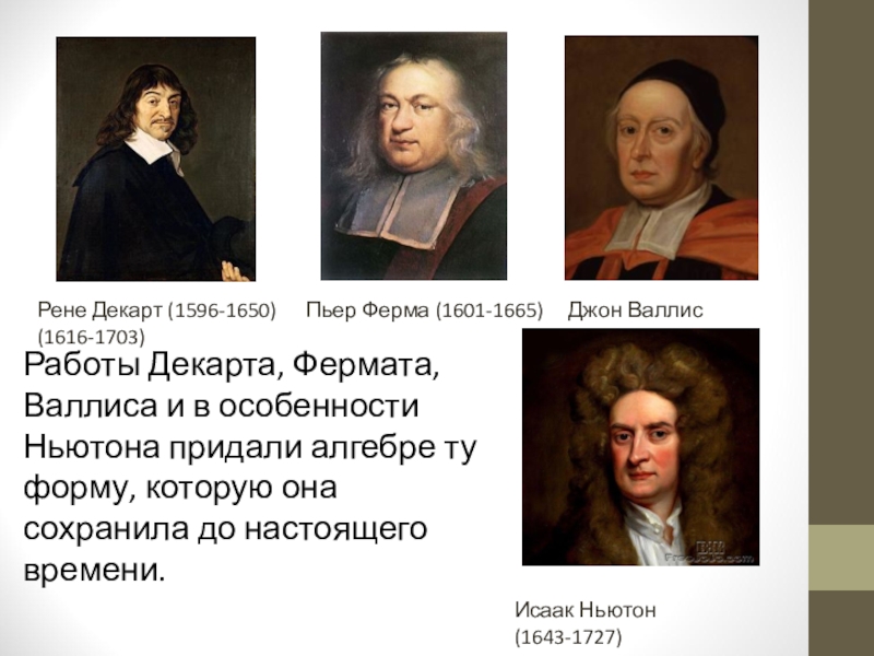 Рене Декарт (1596-1650) Пьер Ферма (1601-1665) Джон Валлис (1616-1703)