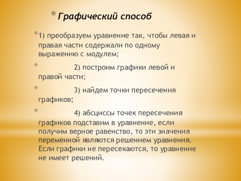 Графический способ1) преобразуем уравнение так, чтобы левая и правая части содержали по одному выражению с модулем;