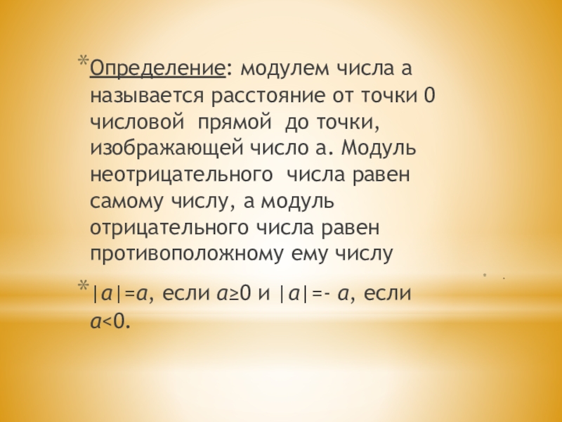 .Определение: модулем числа а называется расстояние от точки 0 числовой прямой до точки, изображающей число а. Модуль неотрицательного числа равен самому числу, а модуль отрицательного числа равен противоположному ему числу|а|=а, если а≥0 и |а|=- а,
