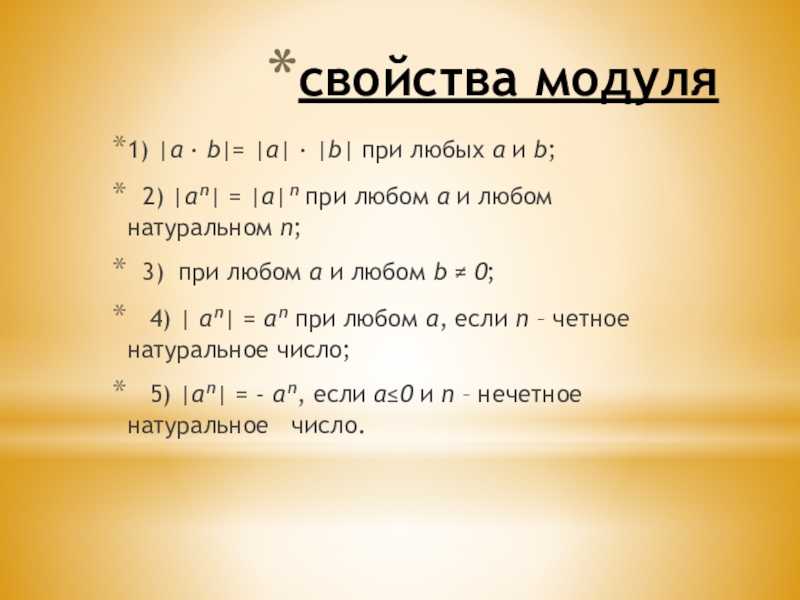 свойства модуля1) |а · b|= |а| · |b| при любых а и b; 2) |аⁿ| = |а|ⁿ