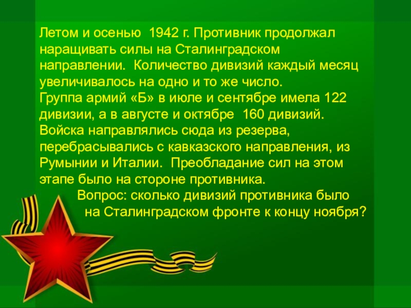 Летом и осенью 1942 г. Противник продолжал наращивать силы на Сталинградском направлении. Количество дивизий каждый месяц увеличивалось