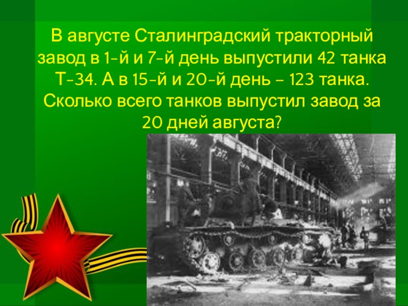 42 танка Т-34. А в 15-й и 20-й день – 123 танка. Сколько всего танков выпустил завод за 20 дней августа?