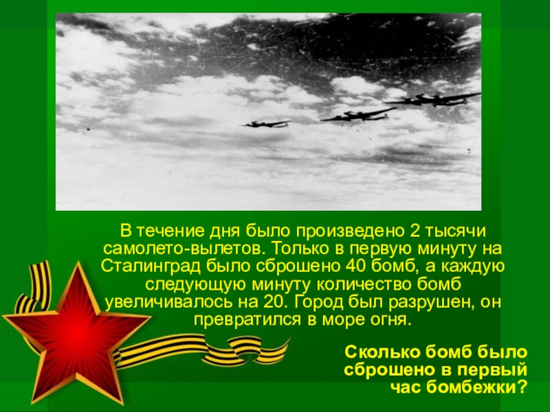 минуту на Сталинград было сброшено 40 бомб, а каждую следующую минуту количество бомб увеличивалось на 20. Город был разрушен, он превратился в море огня.